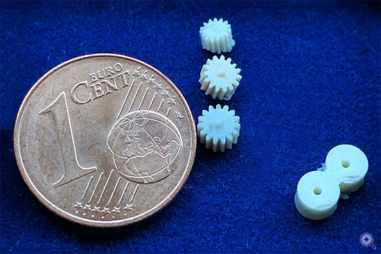 Anwendung: Mikropumpengehäuse und -rotoren, Zahnräder für Mikrogetriebe, Mikrodurchflussmesser, Mikroreaktoren, mikrooptische Bauteile. Die Vorteile sind: einfaches Spritzgussverfahren, hohe Abformgenauigkeit, hohe Oberflächengüte, geeignet zur Massenfertigung, kostengünstige Herstellung.