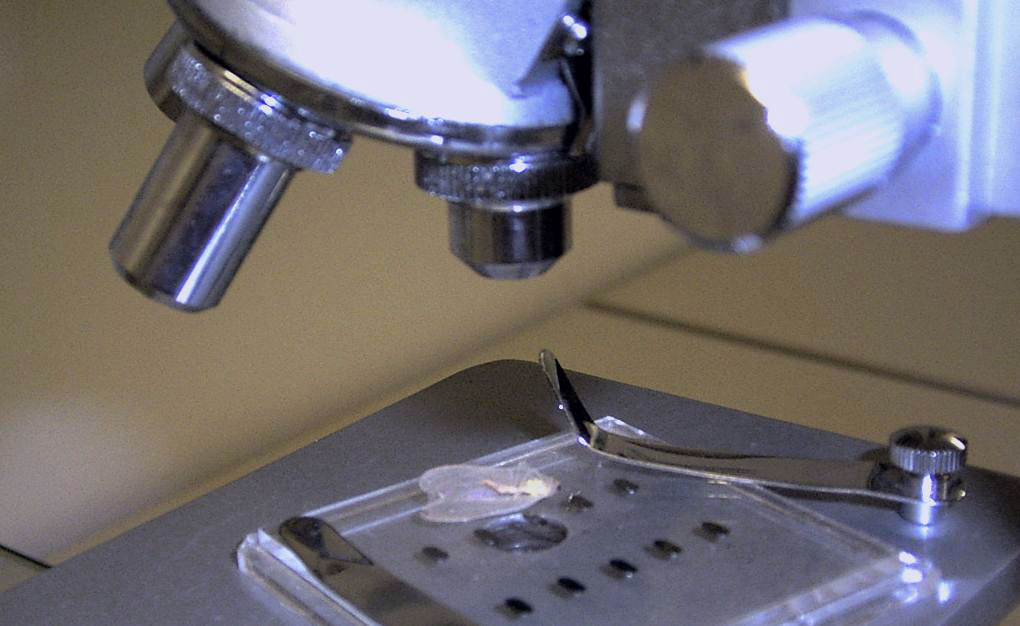 Unter einem optischen Mikroskop kann der Besucher eine Sonde für Rasterkraftmikroskope betrachten und bekommt so ein Gefühl für die feinen Strukturen dieser "Nano-Finger". Man sieht nur den Federbalken, die eigentliche Sonde ist für das optische Mikroskop viel zu klein, um sie darzustellen.